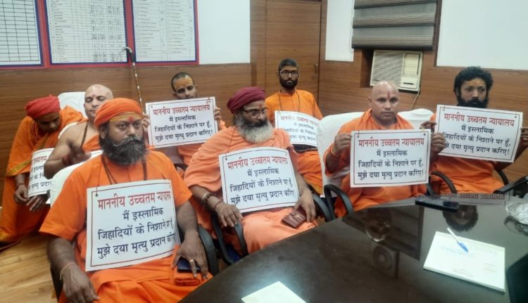 महामंडलेश्वर यति नरसिंहानंद गिरी जी के साथ उनके शिष्यों को भी इस्लाम के जिहादी सर तन से जुदा करने की धमकी अक्सर देते रहते हैं जिससे कारण ये सभी सन्यासी दहशत में रहते हैं।आज उच्चतम न्यायालय दया मृत्यु माँगने गए संयासियों में अमर बलिदानी पण्डित कमलेश तिवारी जी के अभिन्न मित्र योगी सरोजनाथ, यति निर्भयानंद(पूर्व नाम डॉ अरविंद अकेला),स्वामी कृष्णानंद गिरी,यति रामस्वरूपानंद,यति कृष्णानंद, यति रणविजयानंद, यति सत्यानंद,यति यतींद्रानंद तथा अन्य सन्यासी भी थे।