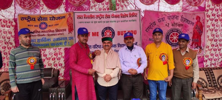 कि विद्यालय के कार्यक्रम अधिकारी एवं जिला समन्वयक जिला सिरमौर राम भज शर्मा की अगुवाई में शिविर बहुत अच्छा रहा! शिविर के समापन समारोह के मुख्य अतिथि डॉ यशवंत सिंह परमार वानिकी विश्वविद्यालय नौणी में फल एवं सब्जी के विभागाध्यक्ष एवं मुख्य वैज्ञानिक के पद पर आसीन डॉक्टर धर्मपाल शर्मा रहे! सर्वप्रथम विद्यालय की राष्ट्रीय सेवा योजना इकाई द्वारा मुख्य अतिथि को वैज, टोपी, अंग वस्त्र एवं स्मृति चिन्ह भेंट कर सम्मानित किया गया! तत्पश्चात विद्यालय के कार्यवाहक प्रधानाचार्य एवं कार्यक्रम अधिकारी राम भज शर्मा द्वारा मुख्य अतिथि के समक्ष सात दिवसीय विशेष शिविर की रिपोर्ट प्रस्तुत की गई!