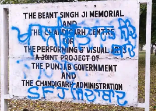 चंडीगढ़ में गणंत्रत दिवस के मौके पर खालिस्तानी नारे लिखे हुए मिलने पर हड़कंप मच गया है। प्राप्त जानकारी के अनुसार चंडीगढ़ के सेक्टर 42 में स्थित बेअंत सिंह मेमोरियल के बोर्ड की दोनों तरफ खालिस्तानी जिंदाबाद व सिख्स फॉर जस्टिस (एस.एफ.जे) जिंदाबाद नारे लिखे हुए मिले। इन नारों को नीले रंग की स्प्रे से लिखा गया है।