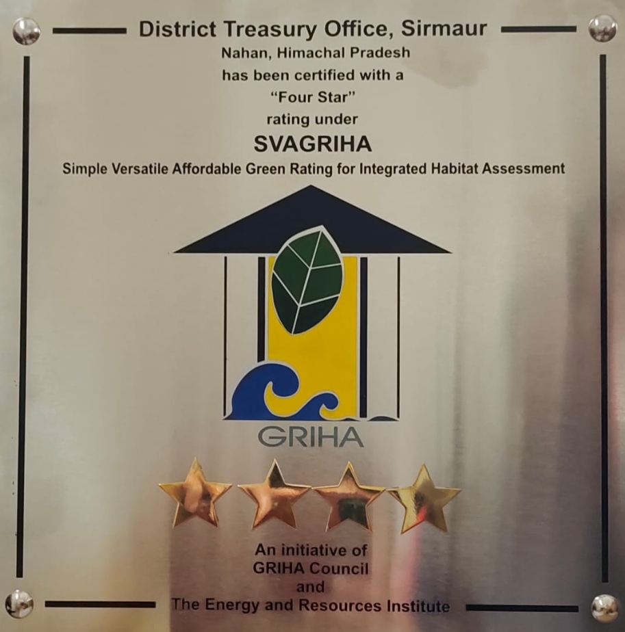 सिरमौर जिला के कोष अधिकारी नाहन राकेश ठाकुर ने बताया कि नव निर्मित जिला कोष कार्यालय भवन नाहन को ग्रीन सर्टिफिकेशन एजेंसी ‘‘सवाग्रिहा’’ (सिंपल वर्सेटाईल अफोर्डेबल ग्रीन रेटिंग फॉर इंटेग्रेटिड हैबिटेट एसेसमेंट) द्वारा फोर स्टार रेटिंग प्रदान की गई है।