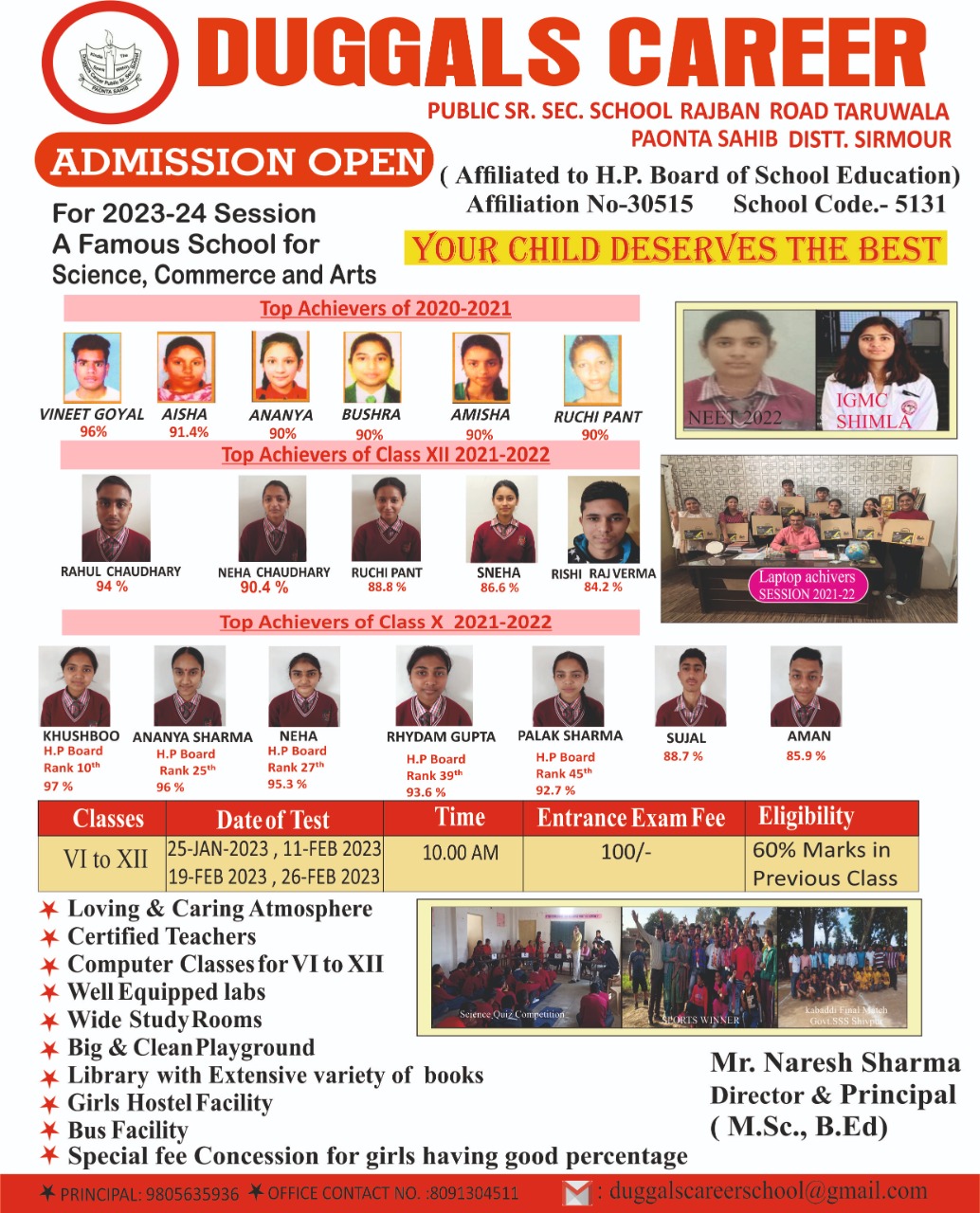 तथा इंजीनियर प्रवीण ठाकुर वर्तमान में हाईकोर्ट में सीनियर असिस्टेंट के पद पर कार्यरत हैं तथा इसी स्कूल से शिक्षा ग्रहण कर चुके छात्र शिक्षा के विभिन्न क्षेत्रों में कार्यरत है पूनम पुंडीर टीजीटी के पद पूनम कपूर जेबीटी तथा रीना पुंडीर एग्रीकल्चर और कुसुम पुंडीर पुलिस विभाग में एएसआई के पद पर कार्यरत है स्कूल के निर्देशक सुरजन सिंह ठाकुर के दिशा निर्देश में स्कूल के समस्त स्टॉफ बधाई के पात्र हैं और स्कूल में पढ़ रहे सभी बचो के उज्जवल भविष्य की कामना करता हैं