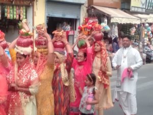 शोभायात्रा में महिलाओं ने कलश उठाकर पैदल समूचे अम्ब उपमंडल के मुख्य बाजारों की परिक्रमा पूरी की।