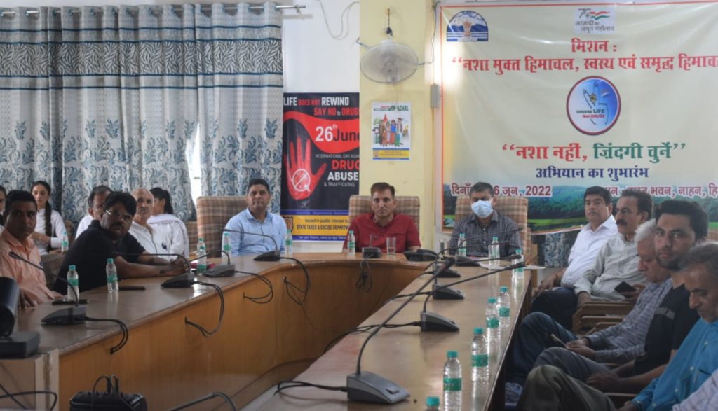सिरमौर जिला में अंतर्राष्ट्रीय नशा निषेध दिवस पर नाहन बचत भवन में आबकारी एवं कराधान विभाग द्वारा नशा नहीं जिंदगी चुनो कार्यक्रम का आयोजन किया गया। कार्यक्रम के अंतर्गत शिमला में आयोजित राज्य स्तरीय कार्यक्रम में मुख्यातिथि मुख्यमंत्री जय राम ठाकुर का संदेश वर्चुअल माध्यम से सुना गया।