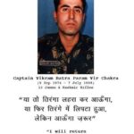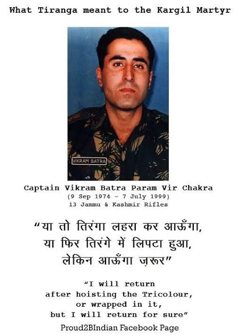 और आएमए में कमिशन प्राप्त करने के उपरांत भारतीय सेना में शामिल हुए थे और कारगिल युद्ध में शहीद हो गए थे जिनके शब्द थे (ये दिल मांगे मोर)जिनको आज शहीद हुए 23 वर्ष हों चुके हैं जिनके पिताजी श्री गिरधारी लाल बत्रा जी जो शिक्षक है ओर माता जी कमल कान्त बत्रा जी ग्रहणी है और भाई का नाम विशाल बत्रा है और दो बहनें हैं, कैप्टन विक्रम बत्रा जी एक जिन्दा दिली ओर वीर सेनिक थे जिन्होंने अपनी जान की परवाह किए बगैर ही दुश्मनों के छक्के छुड़ाते रहें और दुश्मनों के 19 सैनिकों को मौत के घाट उतार दिए थे आज हम आपको उनके पिताजी के 22 वर्ष पूर्व की बात करते हैं जब शहीद कैप्टन विक्रम बत्रा जी के पिताजी श्री गिरधारी लाल बत्रा जी ने रक्षा मंत्रालय को एक निवेदन पत्र लिखा था जिसमें उन्होंने निवेदन किया था कि मुझे उस जगह पर जाने की आज्ञा दी जाएं जहां पर मेरा बेटा वीरगति को प्राप्त हुआ ताकि मैं वहां के परिदृश्य को देख सकूं और महसूस भी कर पाऊ ओर उन्होंने साथ साथ यह भी दर्शाया था कि अगर मेरे आवेदन के विषय पर राष्ट्रीय सुरक्षा को कोई खतरा है तो वह आवेदन वापस भी ले सकते हैं तो जब उनके आवेदन को सम्बन्धित अधिकारी ने देखा तो उन्होंने मन में सोचा कि इनके आवेदन पर सरकार ओर रक्षा मंत्रालय का काफी खर्च आएगा , परन्तु उन्होंने मन बनाया की अगर रक्षा मंत्रालय उनके आवेदन को स्वीकार भी नहीं करतीं हैं तो वह अपने निजी खर्च से शहीद कैप्टन विक्रम जी के पिताजी ओर माताजी को उस स्थान पर जरूर लें जाएंगे जहां पर उस वीर योद्धा ने भारत मां के खातिर शहादत पाईं थीं तो जब श्री गिरधारी लाल बत्रा जी ओर माताजी कमल कान्त बत्रा जी उस स्थान पर पहुंचते हैं तो वहां सभी सैनिकों और अधिकारियों द्वारा भव्य स्वागत किया जाता है और उसी सैन्य अधिकारी ने कैप्टन विक्रम बत्रा जी के पिताजी गिरधारी लाल बत्रा जी को पुष्पों की माला पहनाकर उनके चरण स्पर्श किए तो कैप्टन विक्रम बत्रा जी के पिताजी ने कहा कि आप मेरे पांव क्यों छू रहें आप तो एक उच्च अधिकारी रहें हैं तो उस अधिकारी का जबाव आया कि सर मैं बड़ा सौभाग्यशाली हूं की मुझे आपके पांव छूने और पुष्प अर्पित करने का सौभाग्य प्राप्त हो रहा है क्योंकि मैं उस दौरान मौजूद था जब आपके वीर पुत्र कैप्टन विक्रम बत्रा ने कारगिल युद्ध में दुश्मनों के छक्के छुड़ा रहे थे और उस समय में लड़ाई के लिए तत्पर था और तभी विक्रम बत्रा ने कहा कि आप तो विवाहित हो ओर बच्चे भी हैं मैं अभी अविवाहित सबसे पहले मैं लड़ाई में जाऊंगा और उन्होंने मुझे जाने से रोक दिया और दुश्मनों के छक्के छुड़ा रहे थे और उन्होंने दुश्मनों के 19 सैनिकों को मौत के घाट उतार दिया था परन्तु जब हमने उस चोटी पर भतहे हासिल कर लिया था तो एक चट्टान के पीछे छुपे पाकिस्तानी सैनिकों के द्