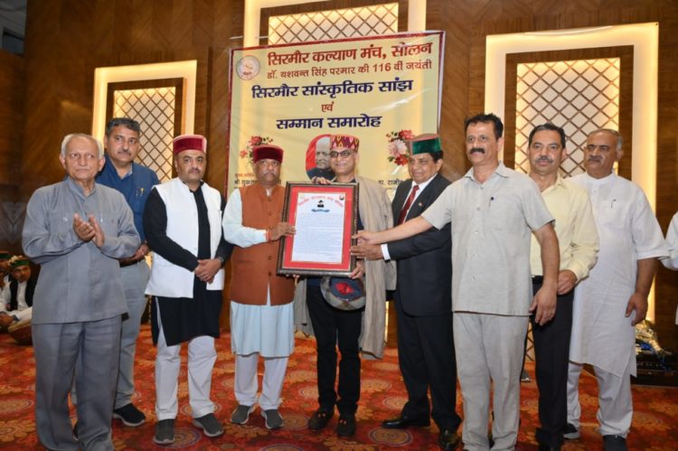 सिरमौर कल्याण मंच की ओर से आयोजित डॉ परमार जयंती कार्यक्रम में उद्योगपति एलडी शर्मा को सिरमौर और डॉ डीपी शर्मा को डॉ यशवंत सिंह परमार सम्मान से नवाजा गया। कार्यक्रम में प्रदेश के ऊर्जा मंत्री चौधरी सुखराम ने बतौर मुख्यातिथि शिरकत की, जबकि कार्यक्रम की अध्यक्षता स्वास्थ्य मंत्री डॉ राजीव सैजल ने की। इस मौके पर सोलन के विधायक डॉ धनीराम शांडिल वशिष्ठ अतिथि रहे।